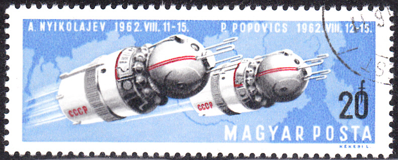 Aus einer Serie "Bemannte Weltraumfahrt" aus Ungarn kommt diese Marke, die an den 1. Gruppen-Raumflug von "Wostok 3" (A. Nikolajew; 11.-15.8.1962) und "Wostok 4" (P. Popowitsch; 12.-15.8.1962) erinnert. Im Hintergrund wird die östliche Sowjetunion gezeigt.