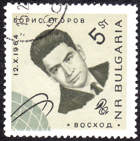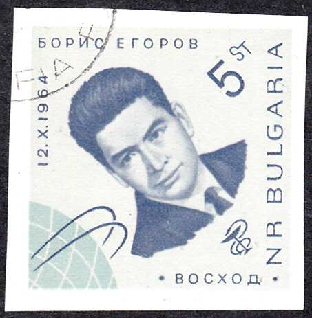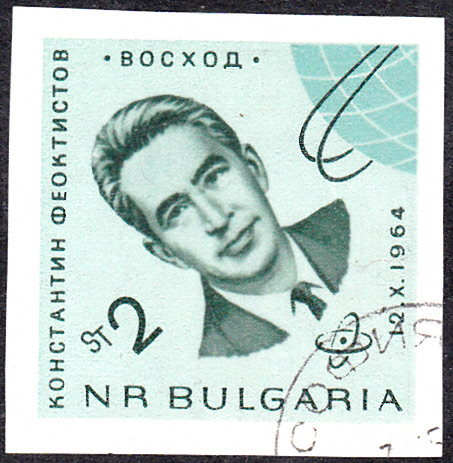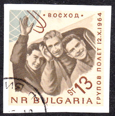 In Bulgarien ist zum Start des sowjetischen Weltraumschiffes "Woschod 1" in einer Markenserie eine Marke mit dem Porträt von Wladimir Komarow (1927-1967, Kommandant von Woscgod 1) erschienen. Hier die geschnittene Marke (MiNr 1517):