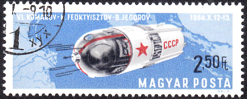 Aus einer ungarischen Serie "Bemannte Weltraumfahrt" stammt diese Marke (MiNr 2305 A). Sie zeigt den Raumflug von "Woschod 1" (W. I. Komarov, K. P. Feokstikov, B. B. Jegorov; 12.-13.10.1964 über der Adria.