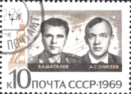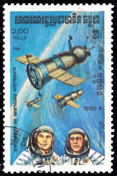 Diese Marke aus der Ausgabe der DDR zum Jubiläum "10 Jahre bemannte sowjetische Weltraumflüge" zeigte auf der rechten Seite der Marke den Staffelflug von Sojus 6,7 und 8.