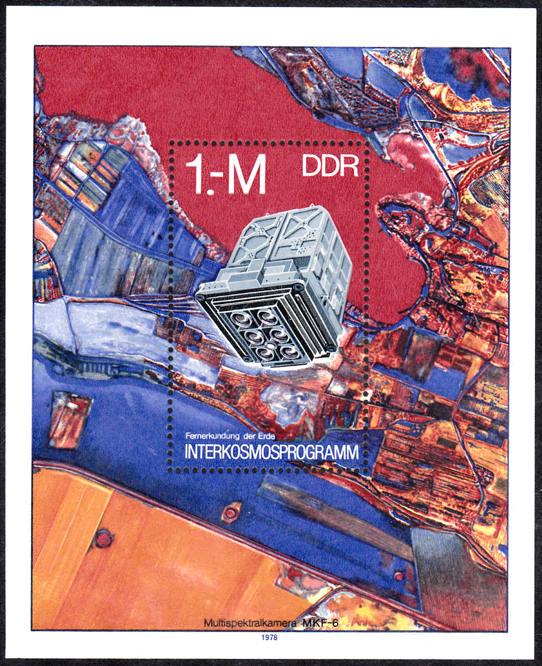 Auf dem Block der DDR (MiNr Block 52) innerhalb einer Ausgabe "Interkosmosprogramm" wird die Fernerkundung der Erde mit der Multispektralkamera MKF-6 dargestellt.