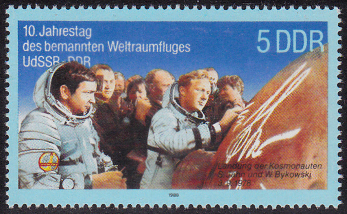 In einer Serie "25 Jahre bemannter Weltraumflug" ist in der DDR diese Marke mit den beiden Kosmonauten Waleri Bykowski und Sigmund Jähn, dem Orbitalkomplex aus Saljut 6 und den zwei angedockten Sojus-Raumschiffen und dem Interkosmos-Emblem erschienen.