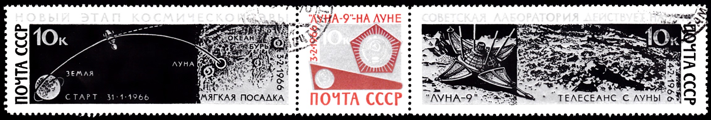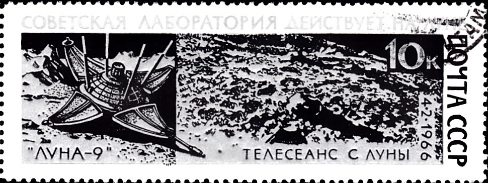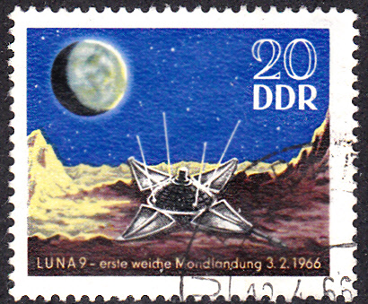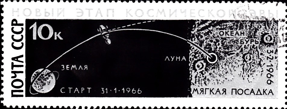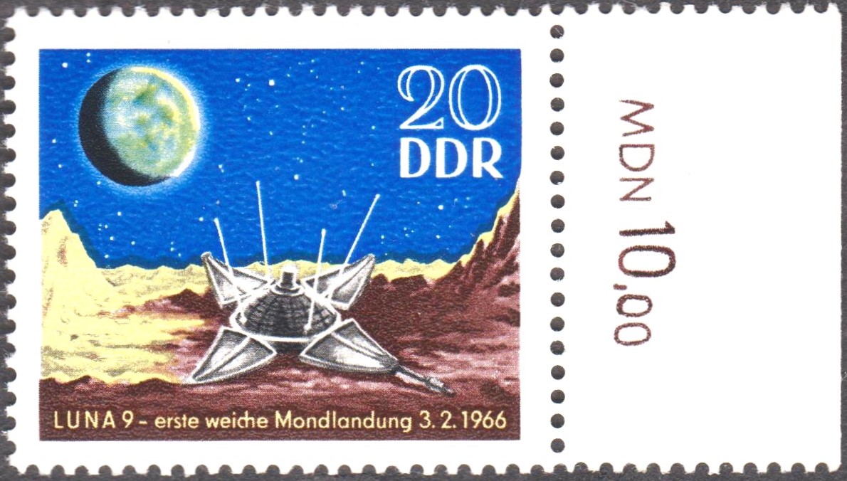 Zur weichen Landung der Mondsonde Luna 9 ist in der Sowjetunion diese Marke (MiNr 3296) erschienen. Sie zeigt die Flugbahn von Luna 9 und nennt Start 31.1.1966 und Landung 3.2.1966.