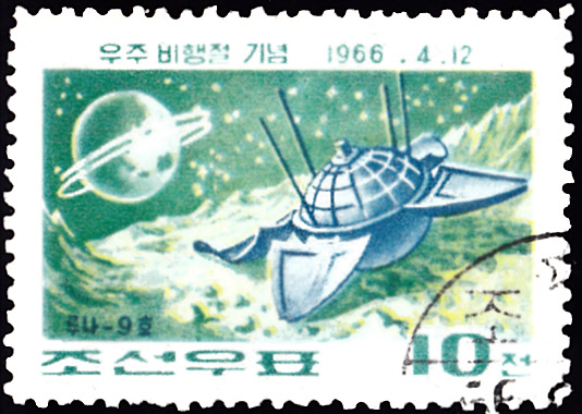 Auf dieser Marken aus Korea-Nord (MiNr 709 A) sehen wir die weiche Landung von "Luna 9" auf der Mondoberfläche.