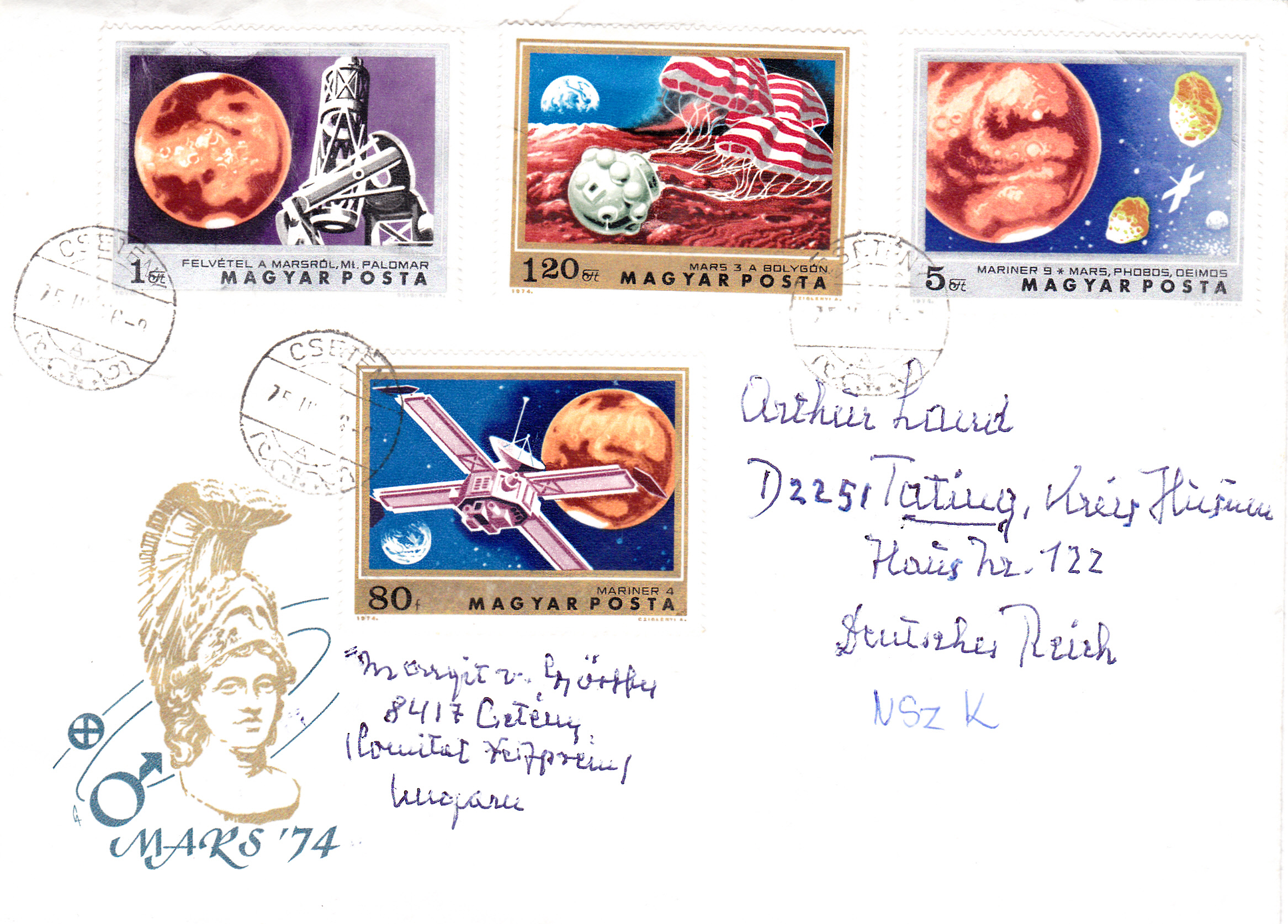 Diese Marke wurde zusammen mit drei weiteren Marke der Serie "Marsforschung" auf diesem Umschlag als Frankatur verklebt.
