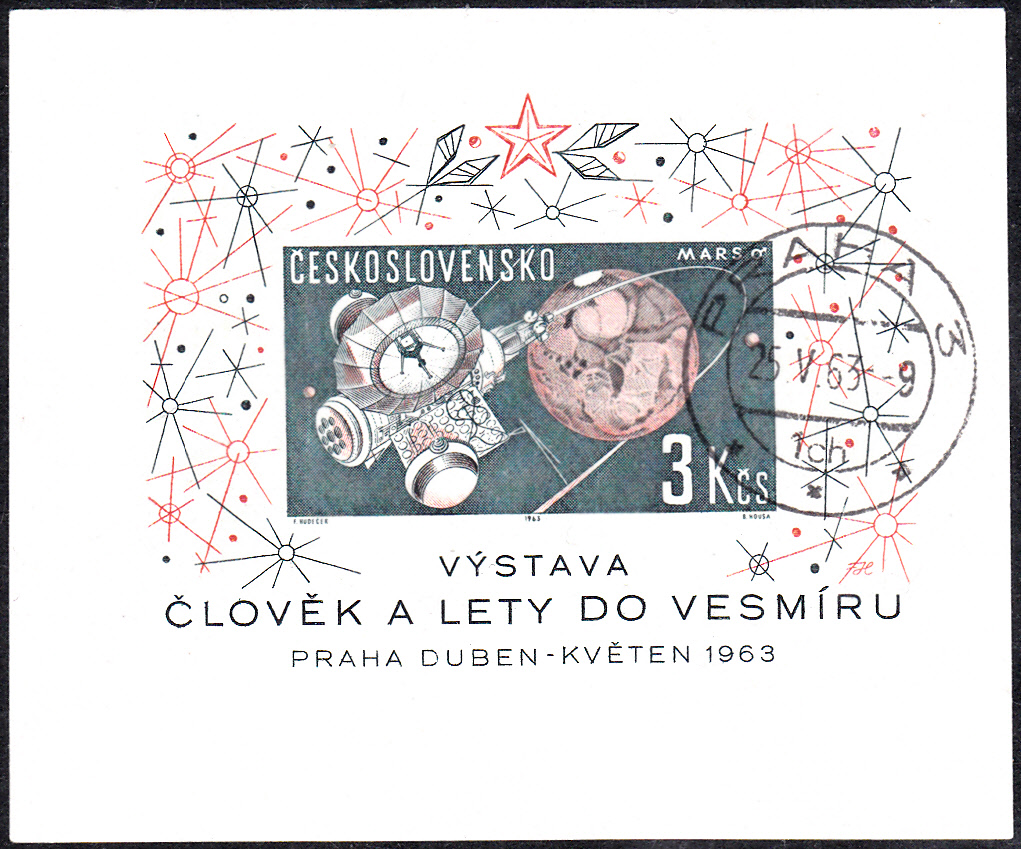 Zur 1. Weltraumforschungsausstellung in Prag ist in der Tschechoslowakei dieser Block (MiNr Block 19 mit Marke MiNr 1402) erschienen. Auf der Marke wird die Raumsonde "Mars 1" vor dem Mars gezeigt.