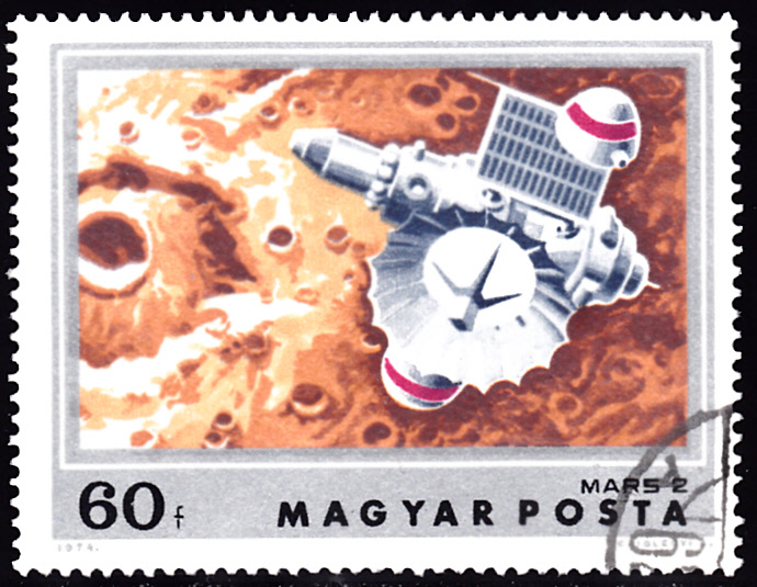 Auf einer weiteren Marke der Serie aus Ungarn (MiNr 2932 A) sehen wir Mars-2 vor dem Mars.