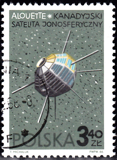 Auf dieser Marke aus Jugoslawien aus einer Serie "Der Weltraum im Dienst der Wissenschaft" (MiNr 1409) wird rechts auch der Ionosphären-Forschungssatellit "Alouette" gezeigt.