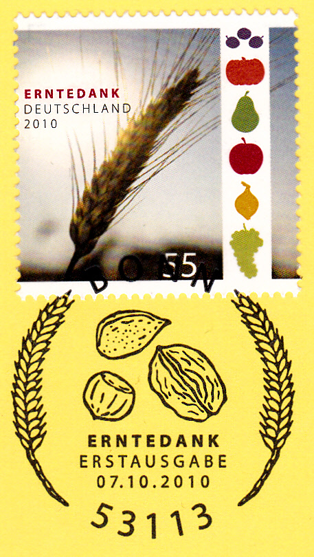 Im Ersttagsonderstempel Bonn zur Ausgabe der Sondermarke "Erntedank " aus dem Jahre 2010 sind unter anderem auch eine Haselnuss und eine Walnuss zu sehen. Das dritte Bild im Stempel ist wahrscheinlich eine "Paranuss", die im botanischen Sinne keine Nuss ist, sondern der hartschalige Samen aus einer Kapselfrucht.