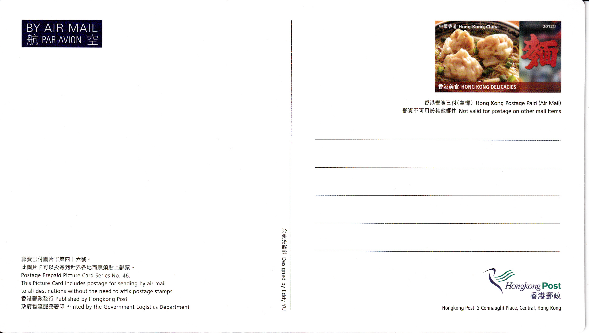 Im "Wertstempel" dieser Ganzsache und auf der Bildseite ist eine Wan-Tan-Suppe abgebildet. Der 3-D-Effekt bei der Bildseite geht beim Scannen leider verloren. Die Abbildung ist identisch mit dem Bild der Marke Hongkong MiNr 1734.