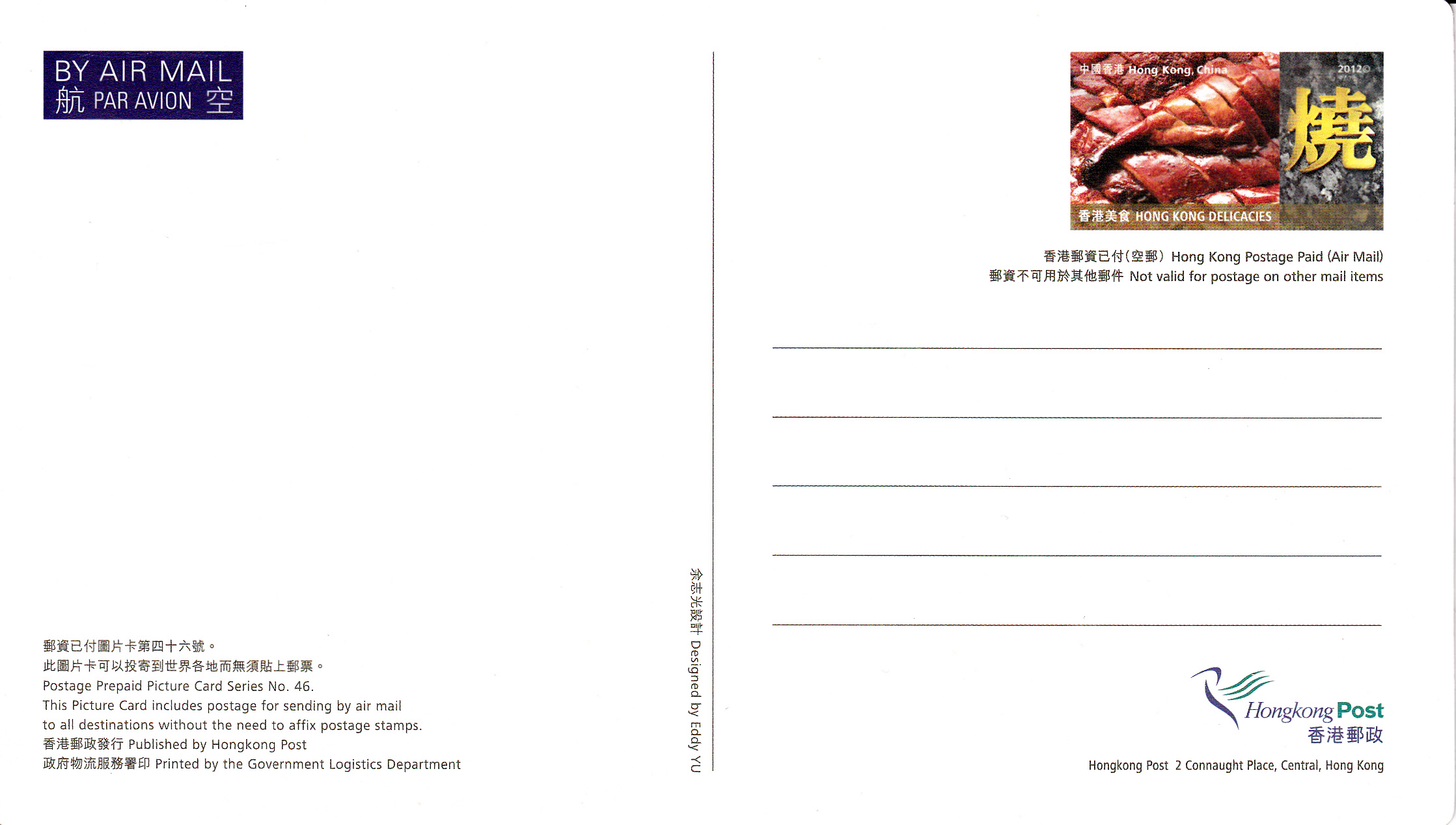 Im "Wertstempel" dieser Ganzsache und auf der Bildseite ist eine gebackene Gans abgebildet. Der 3-D-Effekt bei der Bildseite geht beim Scannen leider verloren. Die Abbildung ist identisch mit dem Bild der Marke Hongkong MiNr 1735.