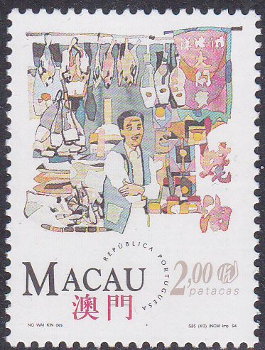 Auf dieser Marke aus Macau (MiNr 765) sehen wir ein Salzfischgeschäft.