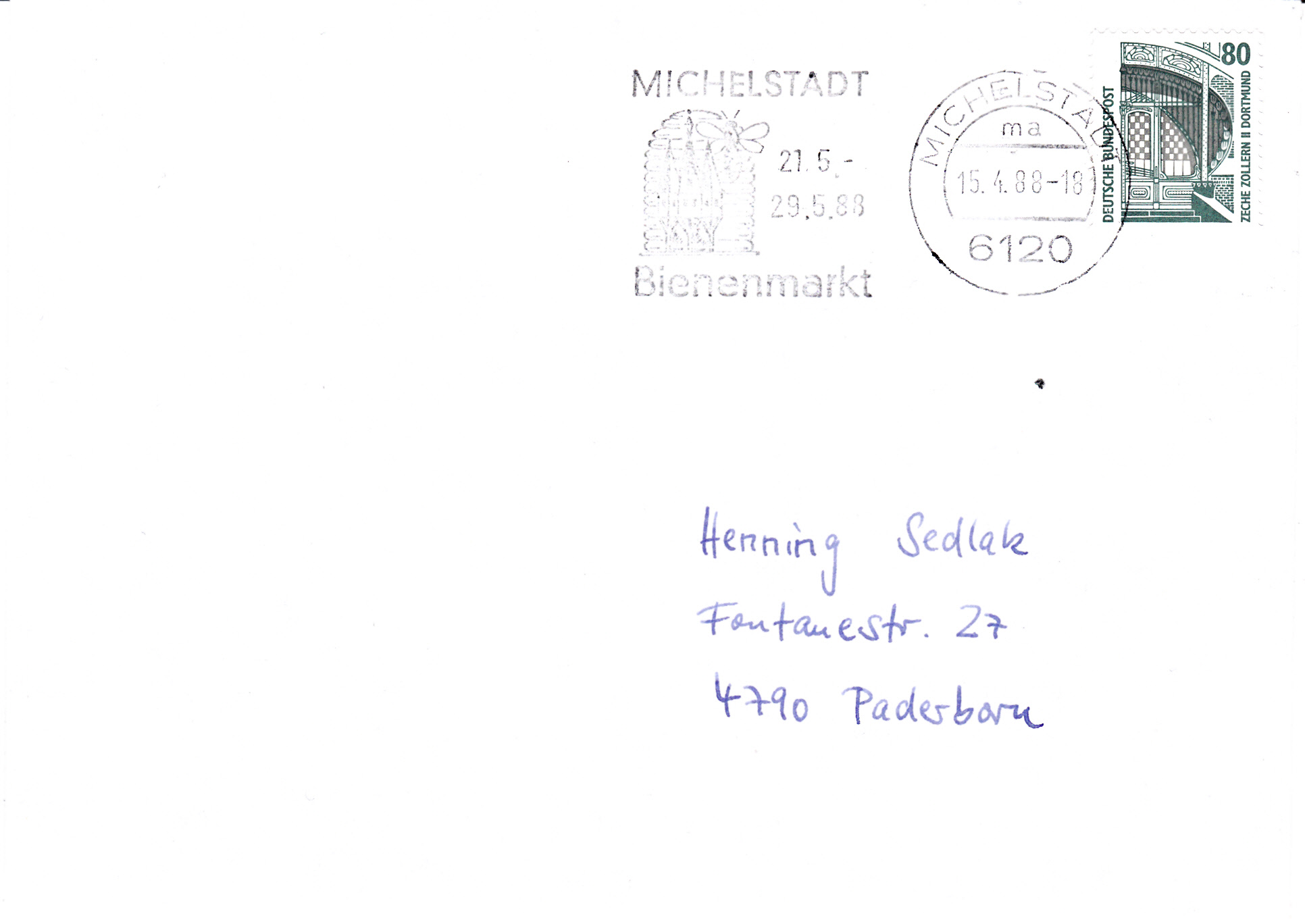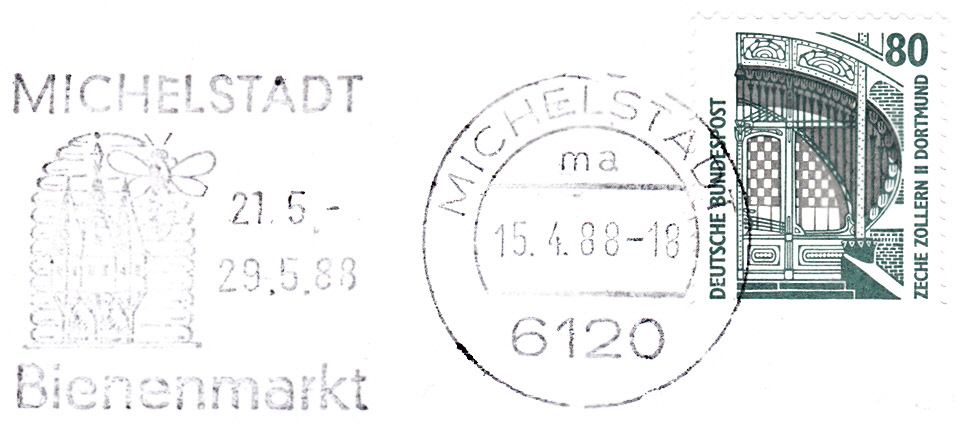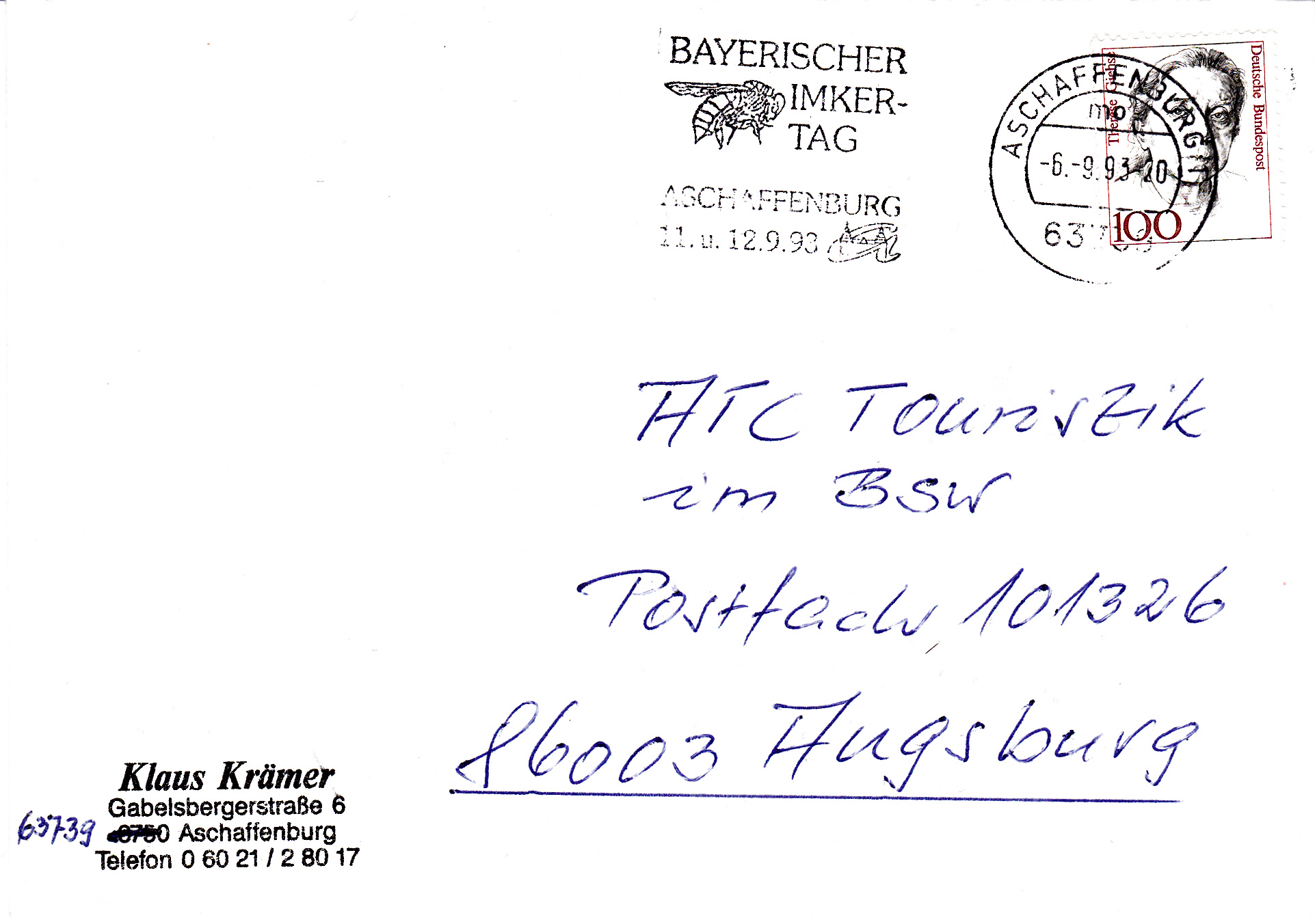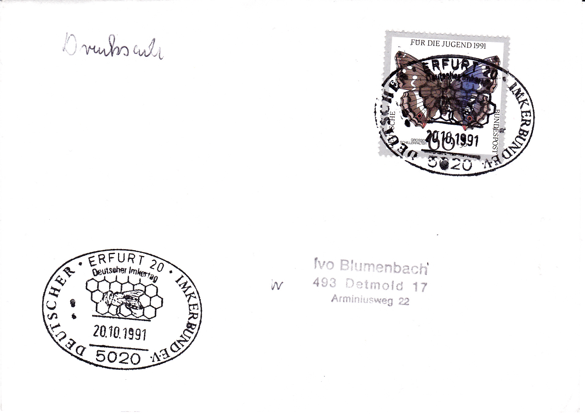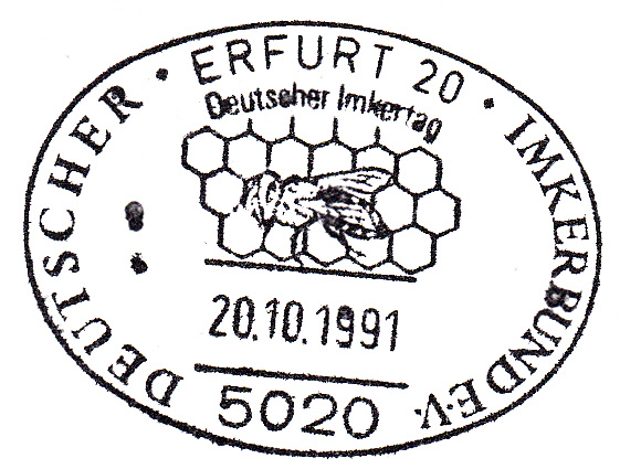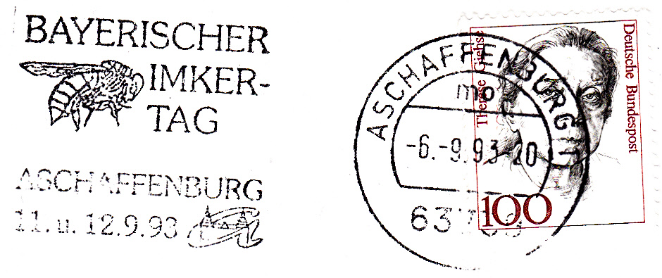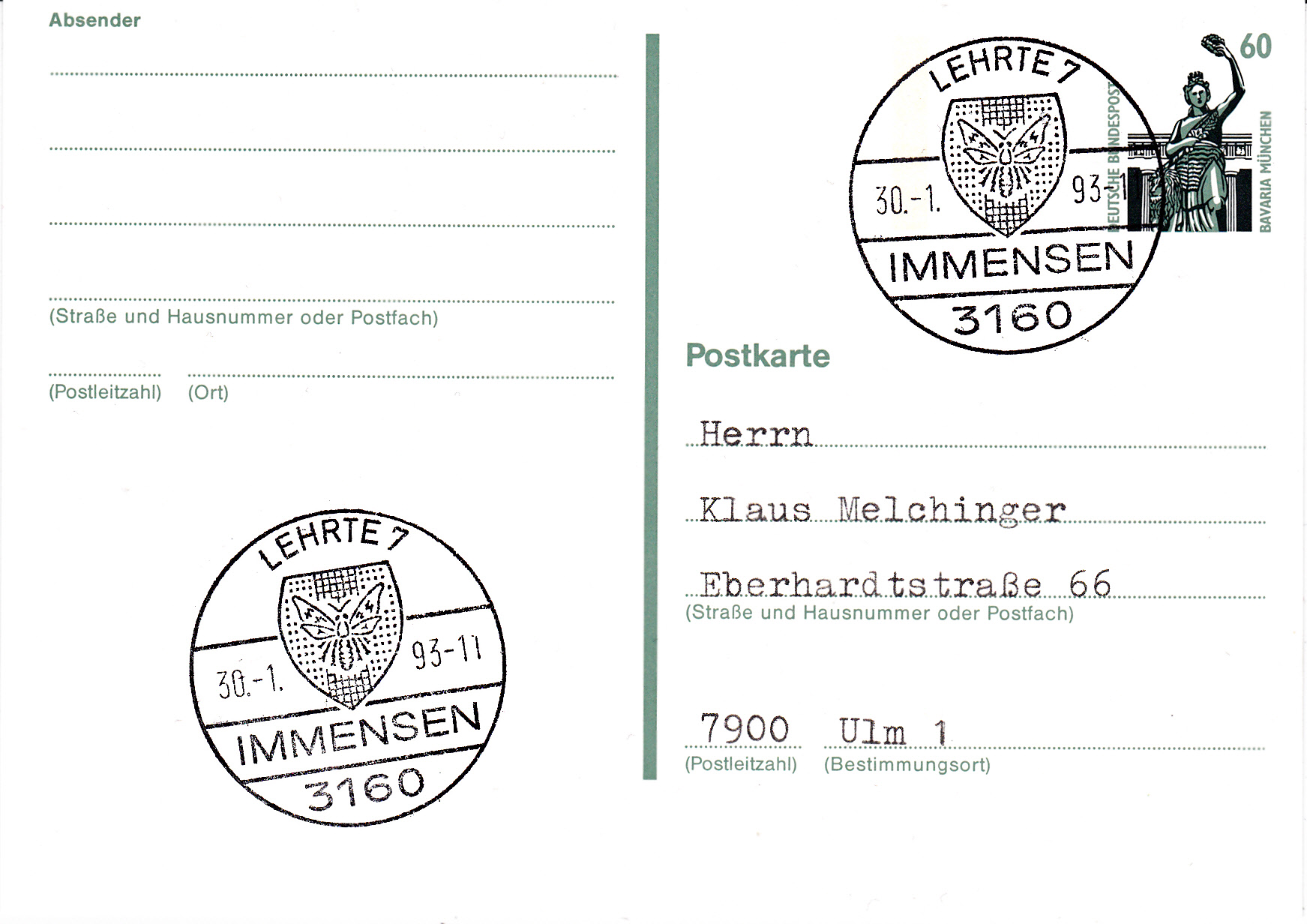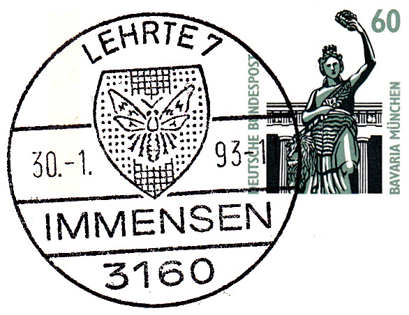 Immensen ist ein Ortsteil der Stadt Lehrte. Das Wappen von Immensen trägt eine Imme, die Westliche Honigbiene. Dieser Werbestempel vom 30.1.1993 aus Lehrte 7 (Immensen) zeigt das Wappen mit der Honigbiene.