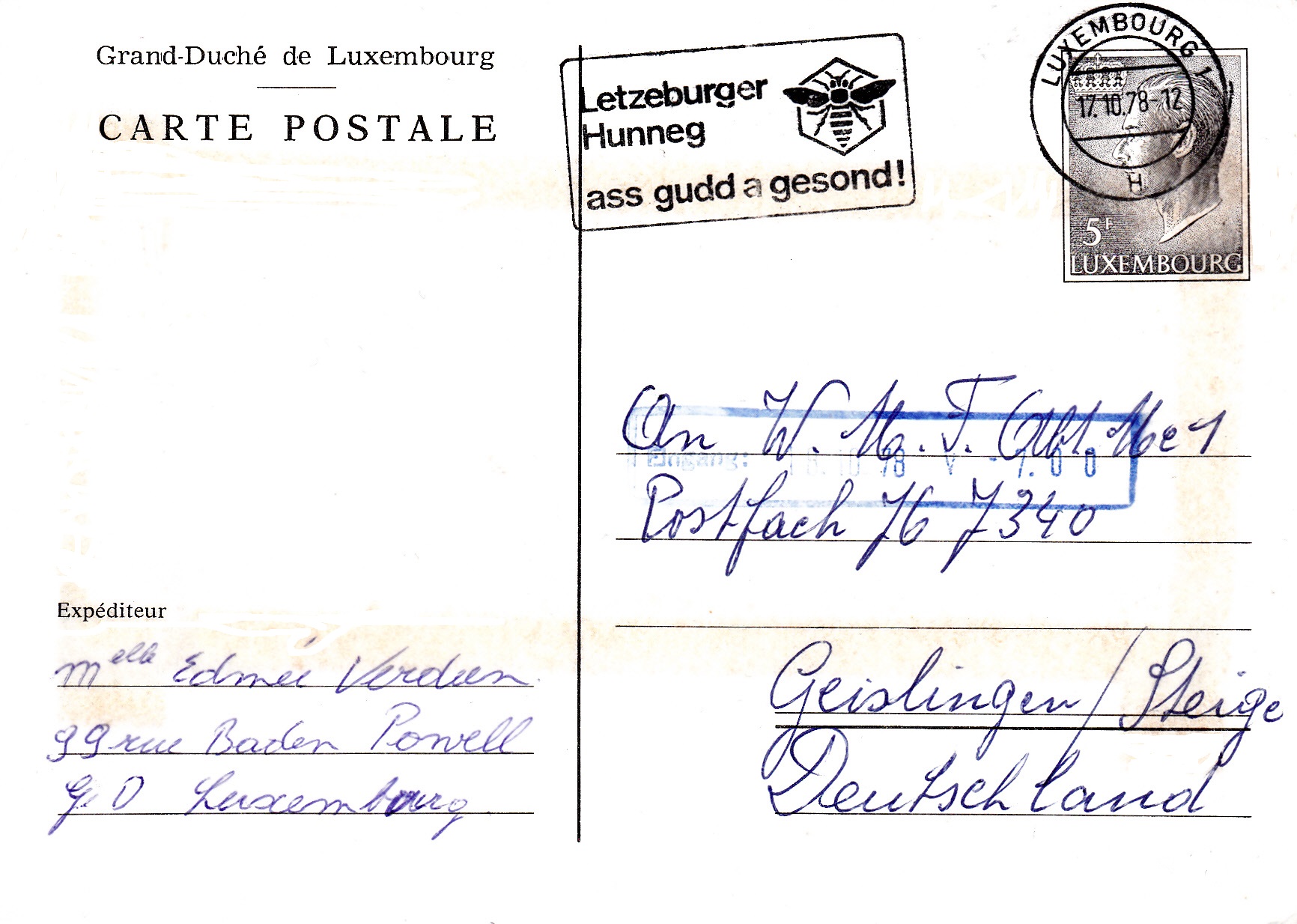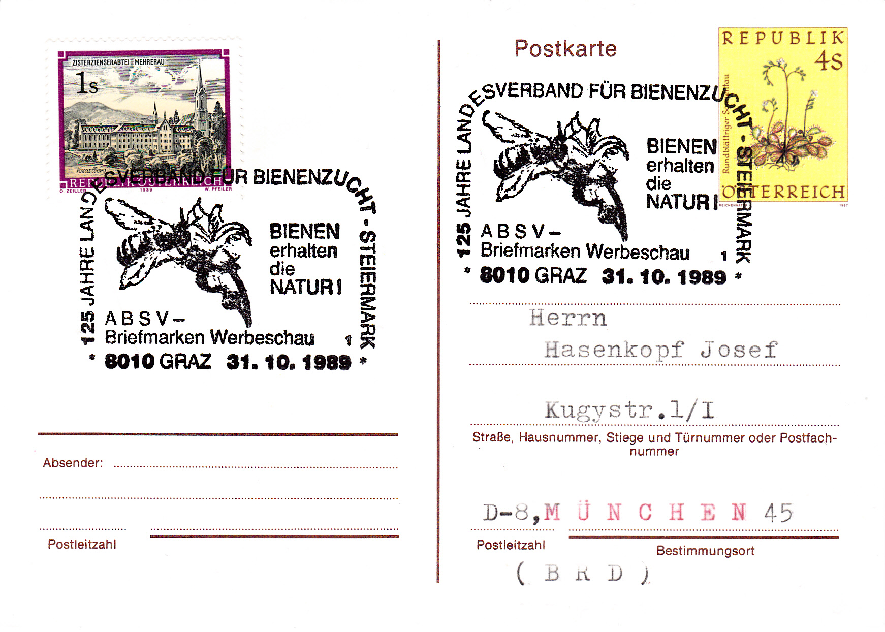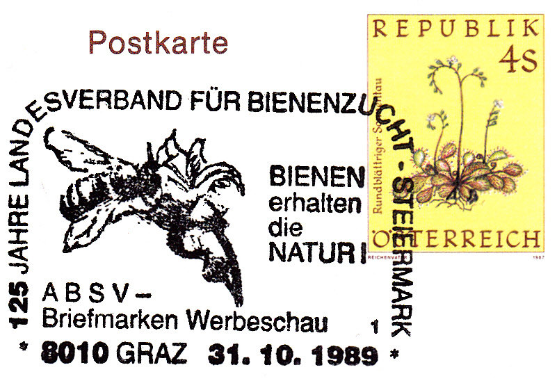 Sonderstempel vom 22.9.1995 aus Schwanenstadt zu 100 Jahre Bienenzüchterverein Schwanenstadt mit der Kennziffer "1". Im Stempel werden eine Biene ein Bienenkasten und ein Bienenkorb in Bienenwaben gezeigt.