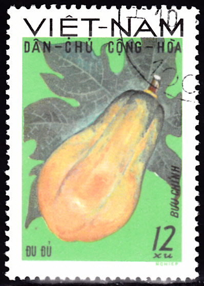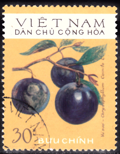 Auf dieser Marke aus Vietnam (MiNr 806) sehen wir einen Zweig des Sternapfelbaumes (Chrysophyllum cainito) mit Früchten.
