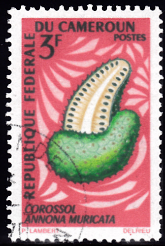Auf dieser Marke aus dem Kamerun (MiNr 508) ist eine hier schon beschriebene Stachelannone (Annona muricata) abgebildet.