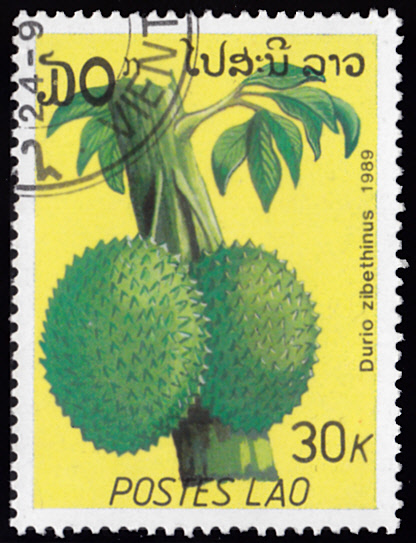 Diese Marke aus Laos (MiNr 1172) zeigt Durianfrüchte (Durio zibethinus), die hier schon beschrieben wurden.