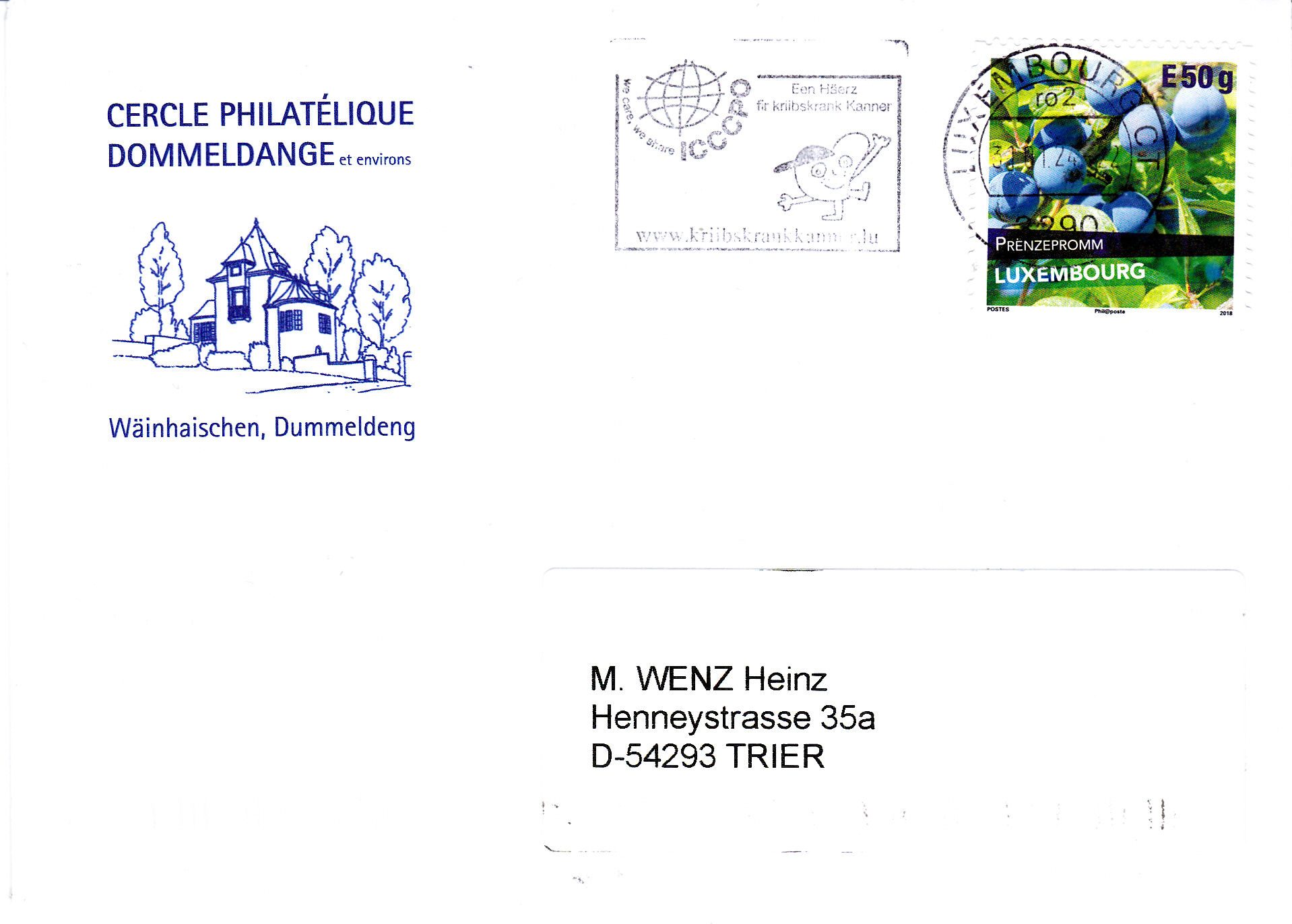 In einer Serie aus Luxemburg werden verschiedene Pflaumenarten gezeigt. Auf dieser Marke (MiNr 2191) sehen wir eine Pflaume mit dem Namen " Prënzepromm" oder "Prune de Prince" (deutsch: Prinzenpflaume). Die "Prinzenpflaume" ist eine in Luxemburg und Belgien seit langer Zeit heimische Sorte.