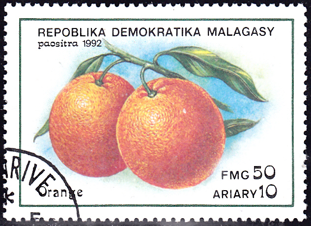 In der gleichen Serie aus Madagaskar gibt es eine Marke (MiNr 1360) mit einem Zweig mit zwei Orangen.