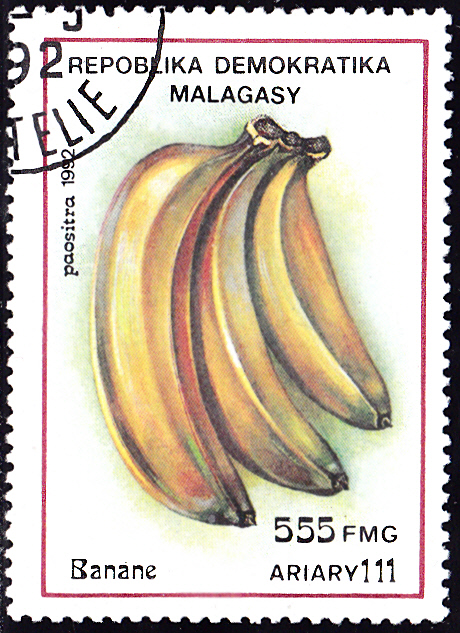 Auf einer weiteren Marke der Serie aus Madagaskar (MiNr 1363) sind drei Bananen abgebildet.