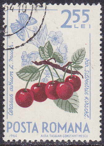 Diese Marke aus Rumänien (MiNr 2368) bildet einen Zweig mit Sauerkirschen (Prunus cerasus) ab. Die Sauerkirche wird auch Weichselkirsche oder oft kurz Weichsel genannt.
