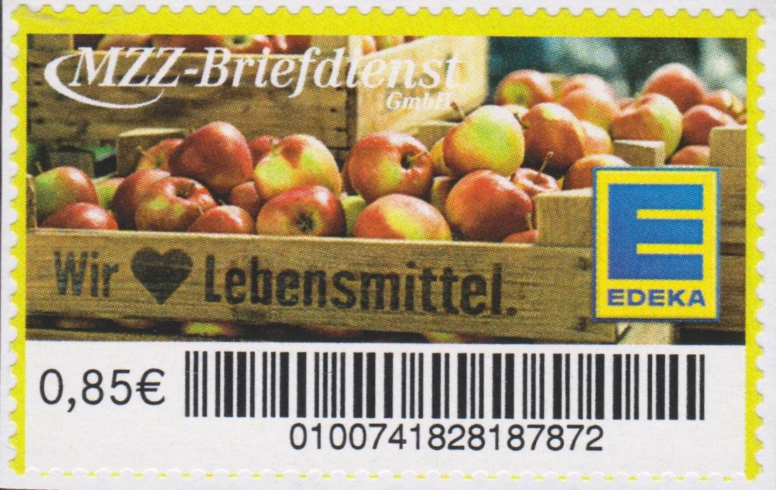 Privatpostmarke der MZZ-Briefdienst GmbH mit dem EDEKA-Slogan "Wir lieben Lebensmittel" sowie frischen Äpfeln im Angebot: