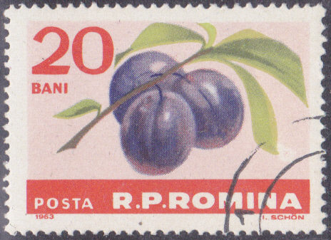 Diese Marke aus Rumänien (MiNr 2177) zeigt einen Zweig mit drei Pflaumen.