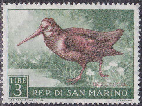 Diese Marke aus San Marino (MiNr 637) zeigt eine weitere Waldschnepfe (Scolopax rusticola).