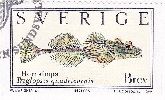 Auf einer weiteren Marke der Serie aus Schweden (MiNr 2245) wird das Vierhörnige Seeskorpion (Myoxocephalus quadricornis) nach einer Zeichnung von Wilhelm von Wright (1810–1887, Naturillustrator) aus dem Bildwerk "Skandinaviens Fische".
