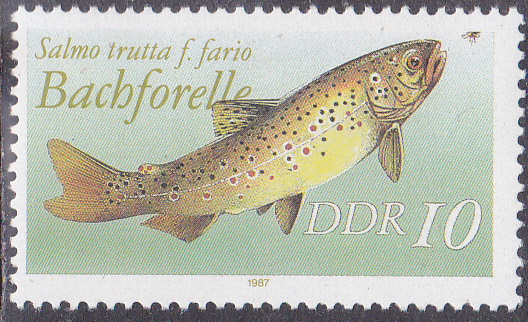 Diese Marke aus der DDR (MiNr 3095) zeigt eine Bachforelle (Salmo trutta fario).