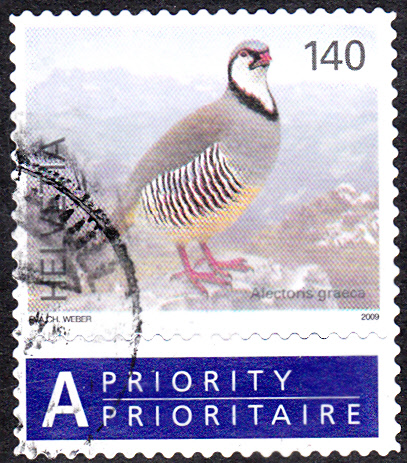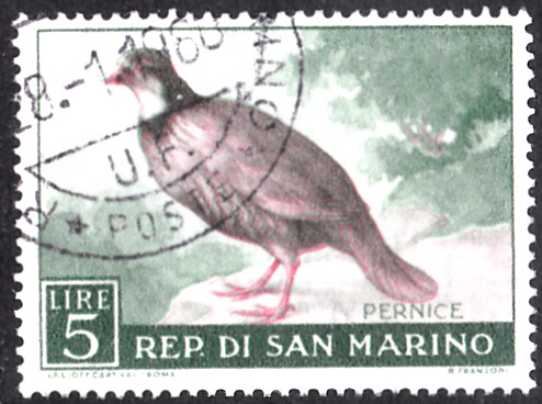 Diese Marke aus San Marino (MiNr 639) zeigt ein Rothuhn (Alectoris rufa).