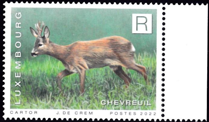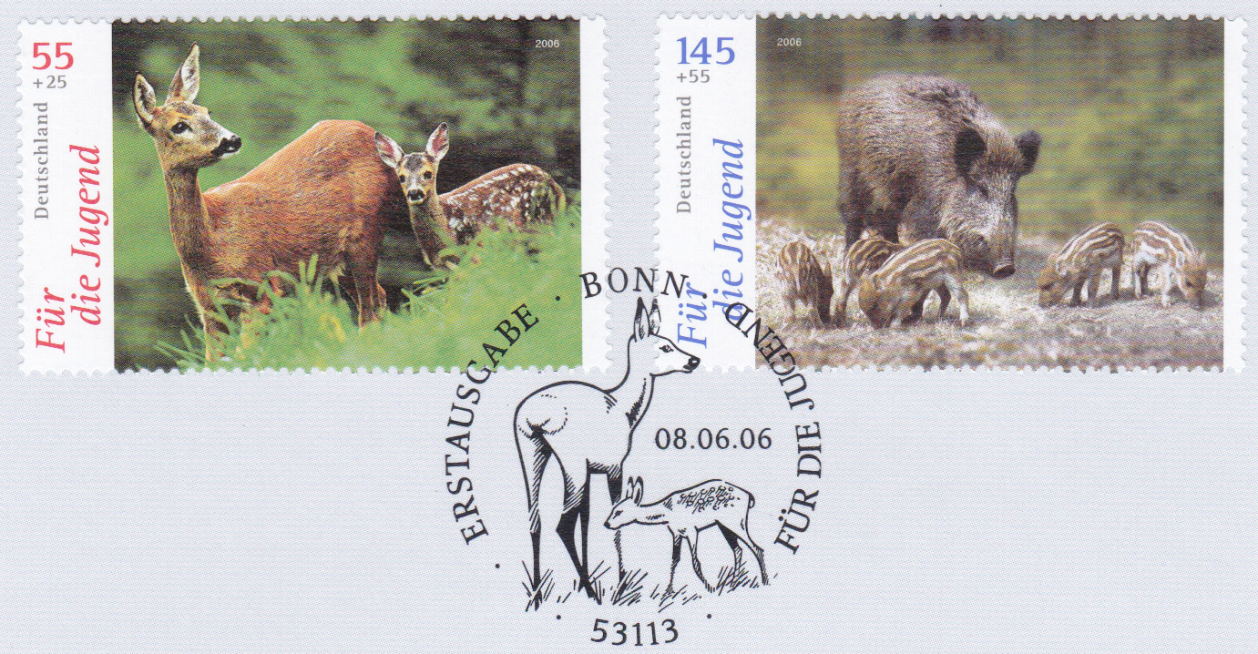 Die hier schon gezeigte Marke (MiNr 2542) mit einem Reh (Capreolus capreolus) mit Kitz aus der Jugendmarkenserie 2006 der Deutschen Post wurde zusammen mit einer weiteren Marke der Serie mit dem Ersttagsonderstempel aus Bonn entwertet. Das Stempelmotiv zeigt ebenfalls ein Reh mit Kitz.