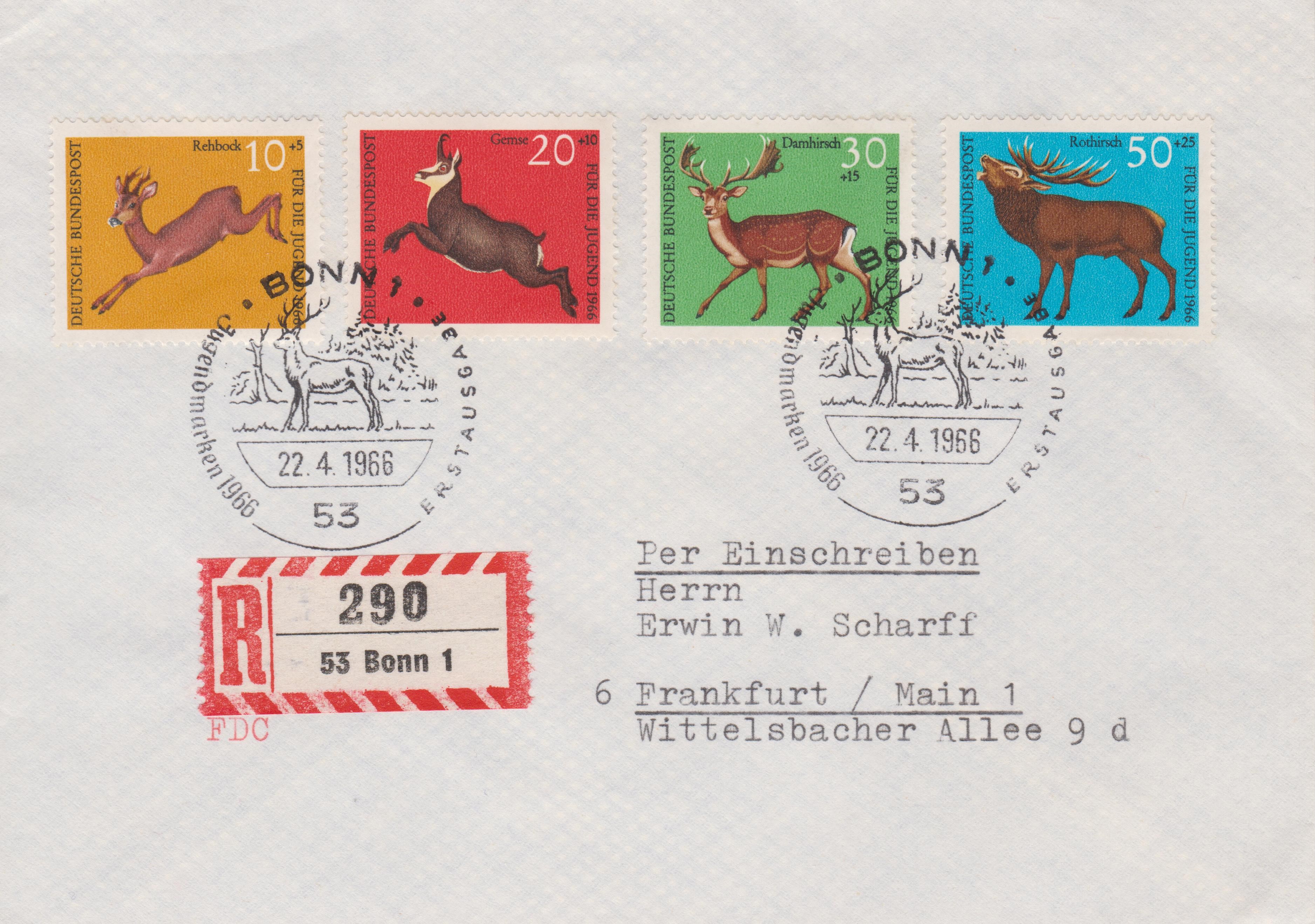 Bei den Jugendmarken 1966 zeigt die Wertstufe 30+15 Pf das Motiv "Damhirsch", hier mit ESST BONN 1 entwertet auf echt gelaufenem, mit 110 Pf portogerecht frankiertem Satzbrief: