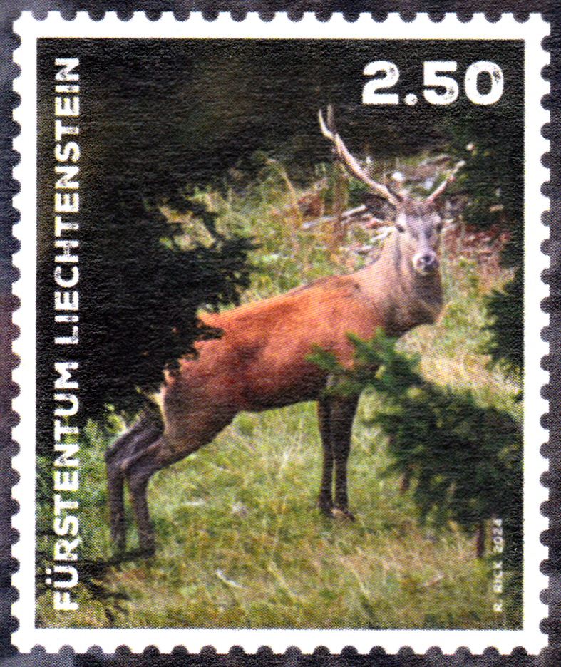 Dieser Rothirsch (Cervus elaphus) kommt aus Liechtenstein (MiNr 2116).
