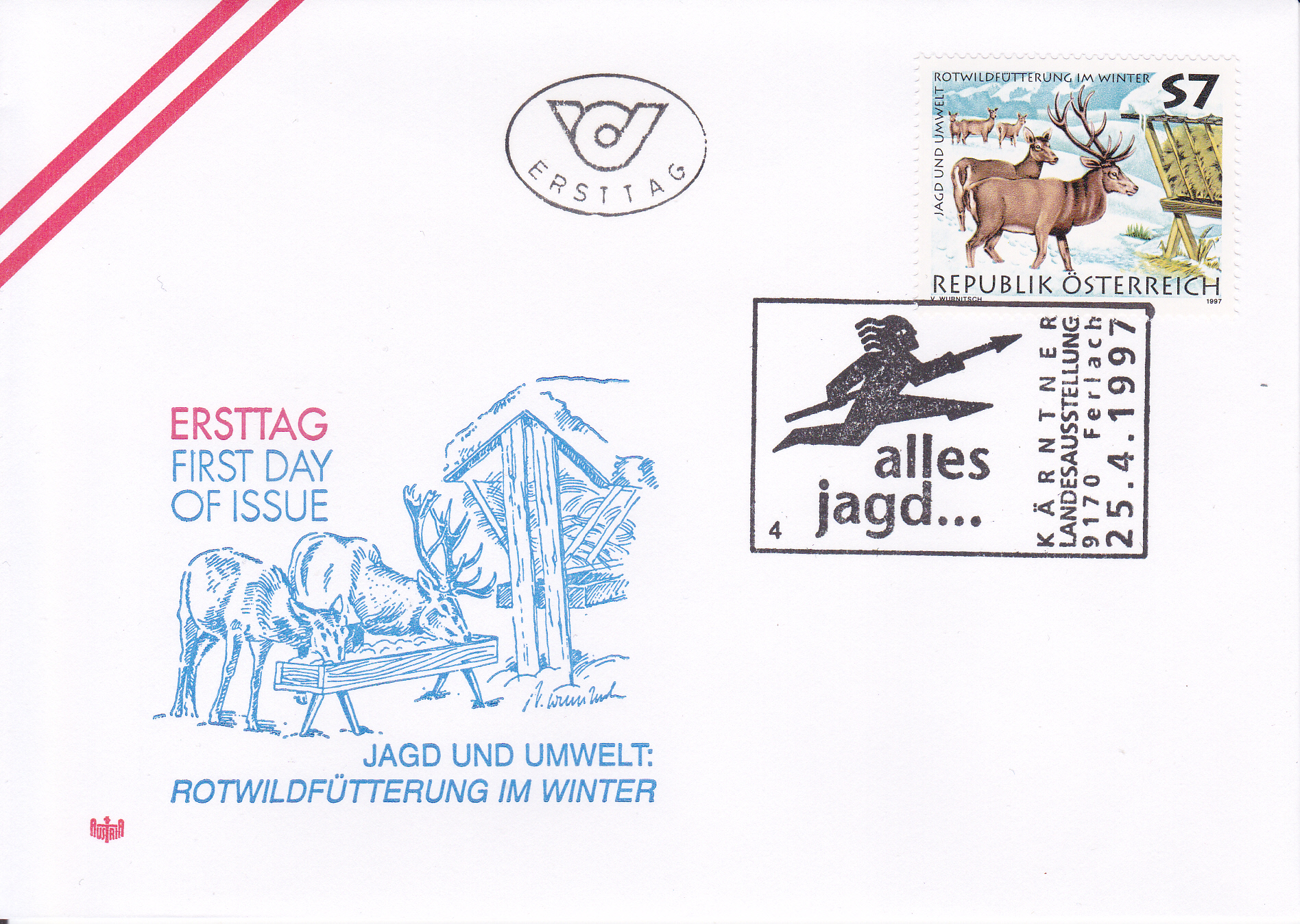 FDC mit der hier bereits gezeigten Marke (MiNr 2216) der Reihe "Jagd und Umwelt" aus Österreich mit der Abbildung "Rotwildfütterung im Winter" und einem zum Motiv "Jagd" passenden Sonderstempel vom 24.4.1997 aus Ferlach mit der Kennziffer "4".