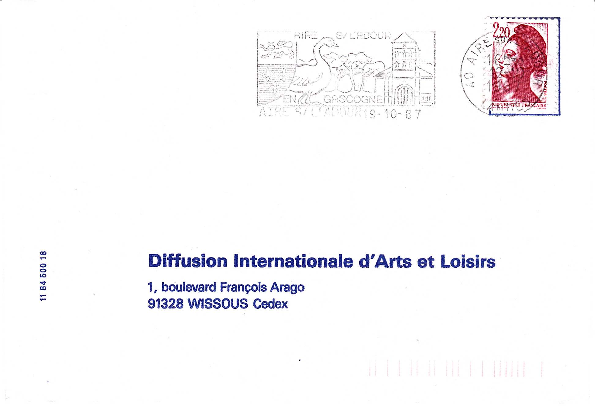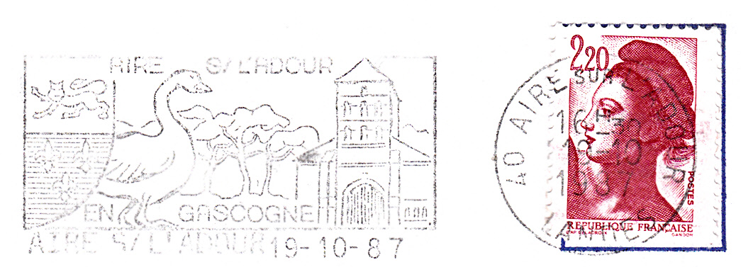 Offenbar ist dies der Grund, warum im Maschinenwerbestempel vom 18.10.1987 aus Aire-sur-l’Adour neben der Kirche Sainte-Quitterie auch eine Gans zu sehen ist.