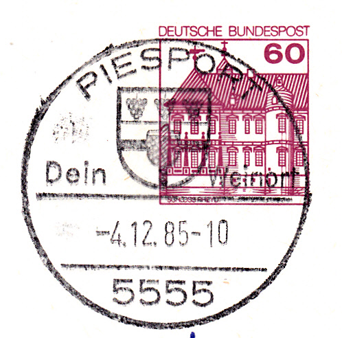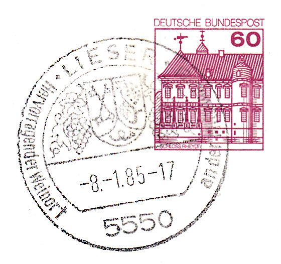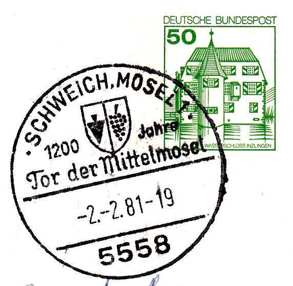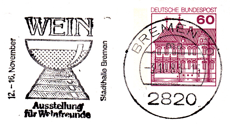 Auf diesem Handwerbestempel vom 3.12.1984 aus Zeltingen-Rachtig sind im Stempelbild ein Rebenblatt, Weintrauben und ein Weinglas (Römer) abgebildet. Der Name "Römer" leitet sich nicht von den Römern ab, sondern vom niederländischen roemen, was so viel wie rühmen bedeutet.