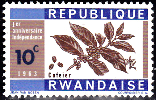 Diese Marke aus der Serie "1 Jahr Unabhängigkeit" aus Ruanda (MiNr 27 A) bildet einen Kaffeezweig ab.