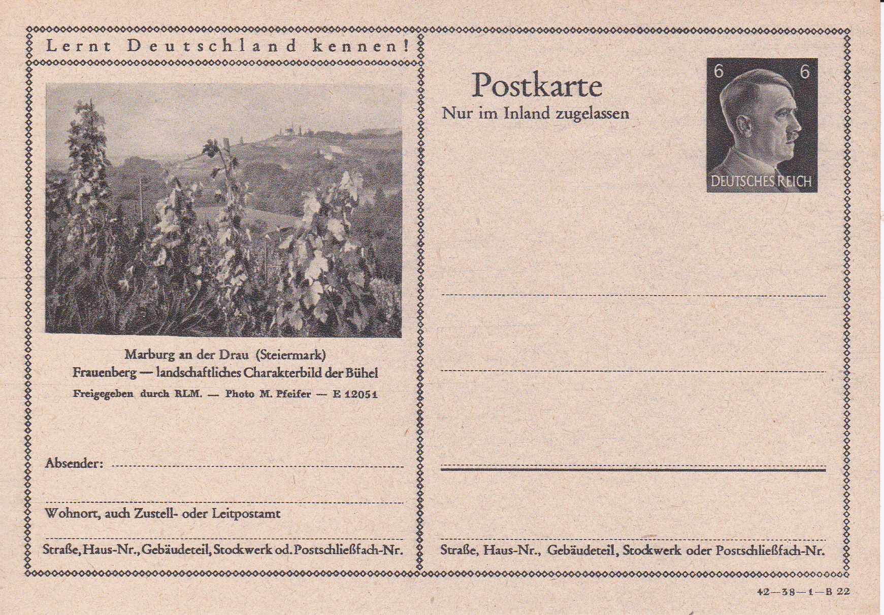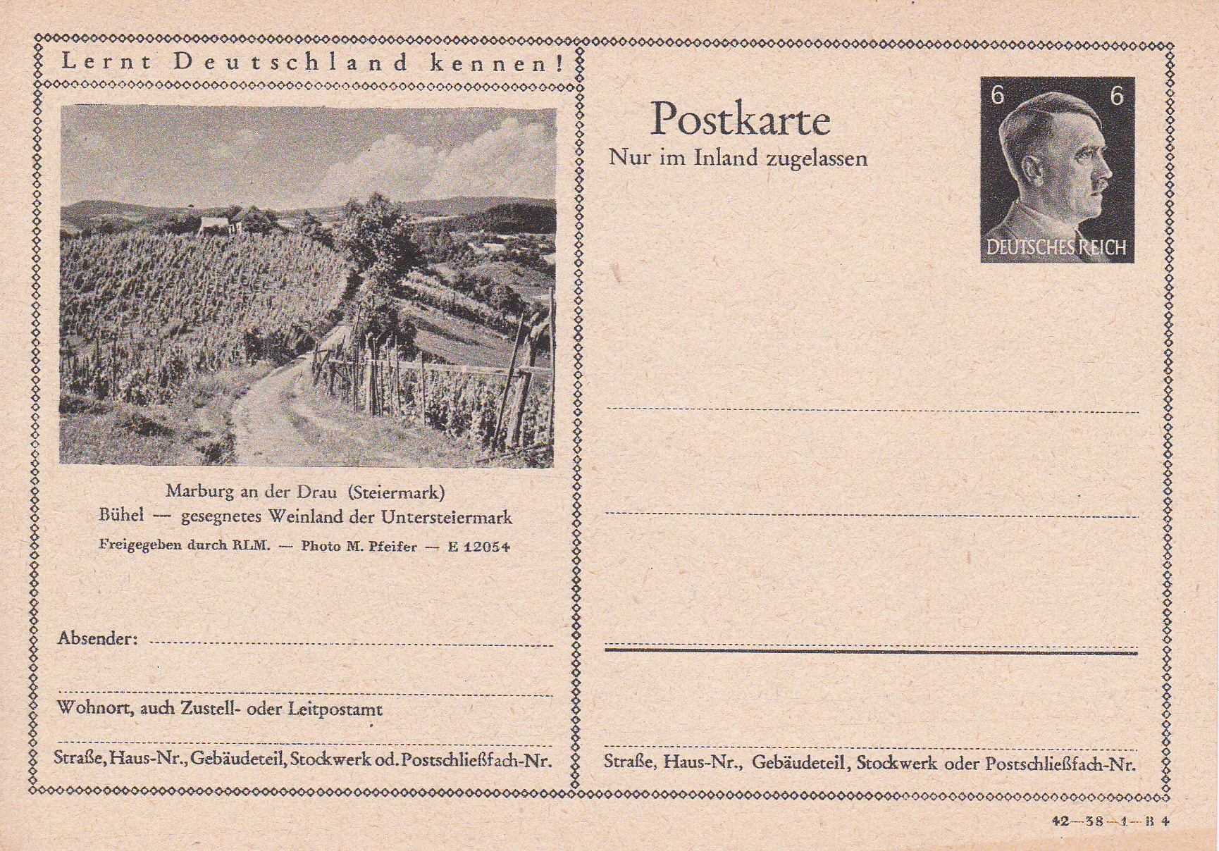Marburg an der Drau wirbt auf dieser Karte (Serie 38 Bild 4) mit der Abbildung eines Weinberges als "Weinland der Untersteiermark". Nach dem Überfall des Deutschen Reiches auf das Königreich Jugoslawien am 6. April 1941 wurde der jugoslawische Teil der Steiermark als CdZ-Gebiet Untersteiermark vom Großdeutschen Reich annektiert. Heute heißt Marburg an der Drau wieder Maribor und liegt im Nordosten Sloweniens.