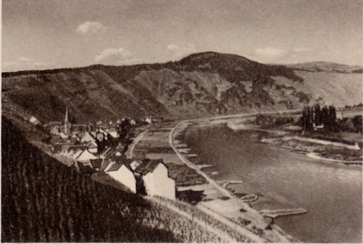 Ürzig (Mosel) wirbt auf dieser Karte (Serie 149 Bild 5) für seinen "Rebensaft", Wald und ein Bad in der Mosel. Links im Vordergrund sind Weinberge zu sehen.