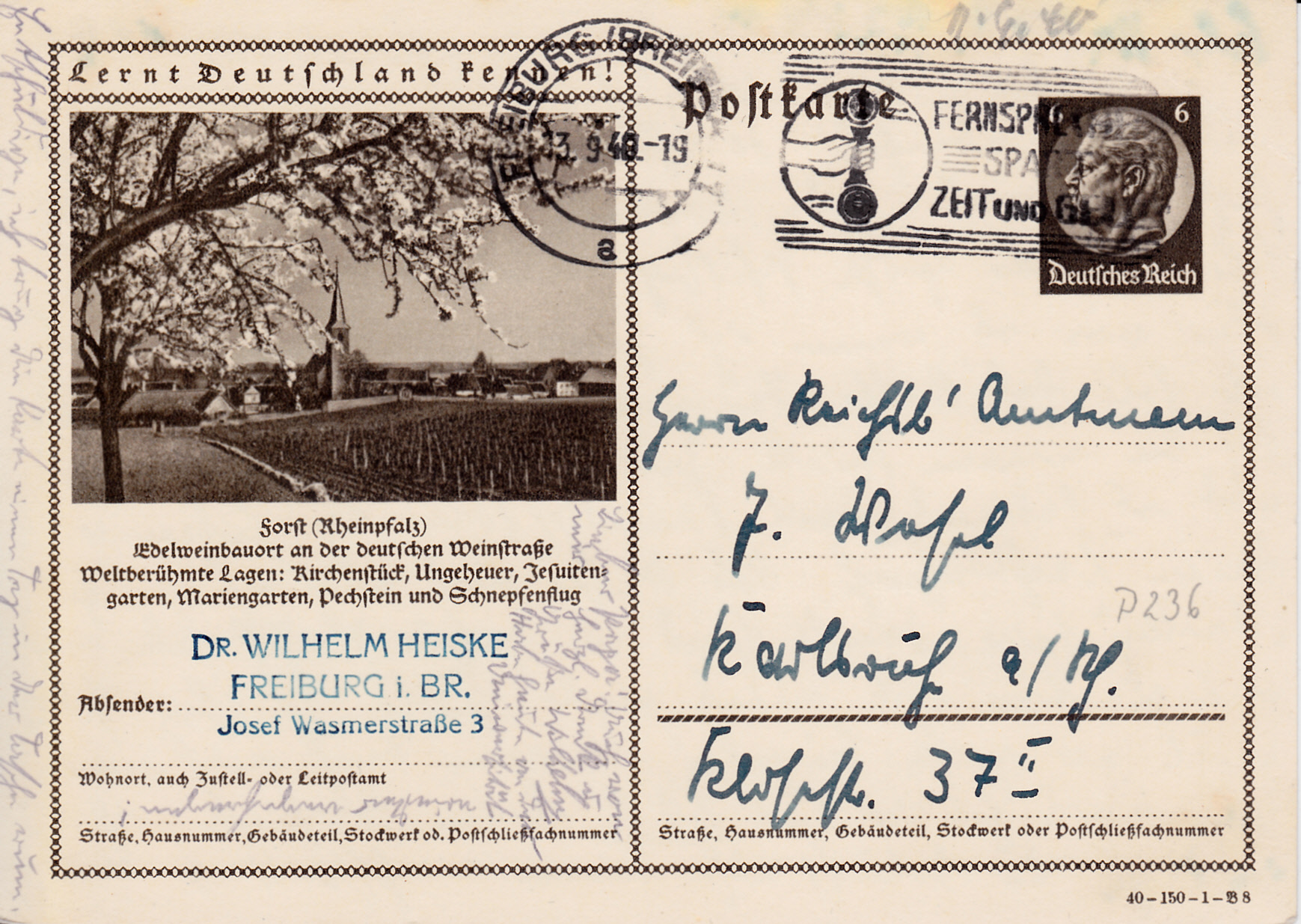 Der Weinort Forst (Rheinpfalz) wiederholt 1940 auf dieser Bildpostkarte (MiNr P 236; Serie 150 Bild 8) das schon früher gezeigte Foto mit einem Wingert und einem Blick auf Forst ab. Es wird außerdem wieder für ein paar Forster Weinlagen im Text geworben.