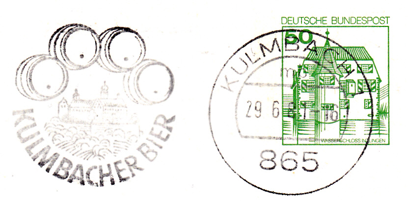 Maschinenwerbestempel aus Kulmbach 1 mit Werbung für "Kulmbacher Bier" im Werbeeinsatz wie vorher, jetzt aber mit vierstelliger PLZ und anderer Schrift bei Kulmbacher Bier (keine fetten Buchstaben mehr) .