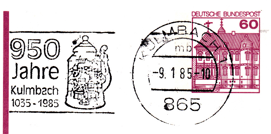 In diesem Maschinenwerbestempel "950 Jahre Kulmbach" vom 8.1.1985 ist im Werbeeinsatz ein Bierkrug abgebildet.