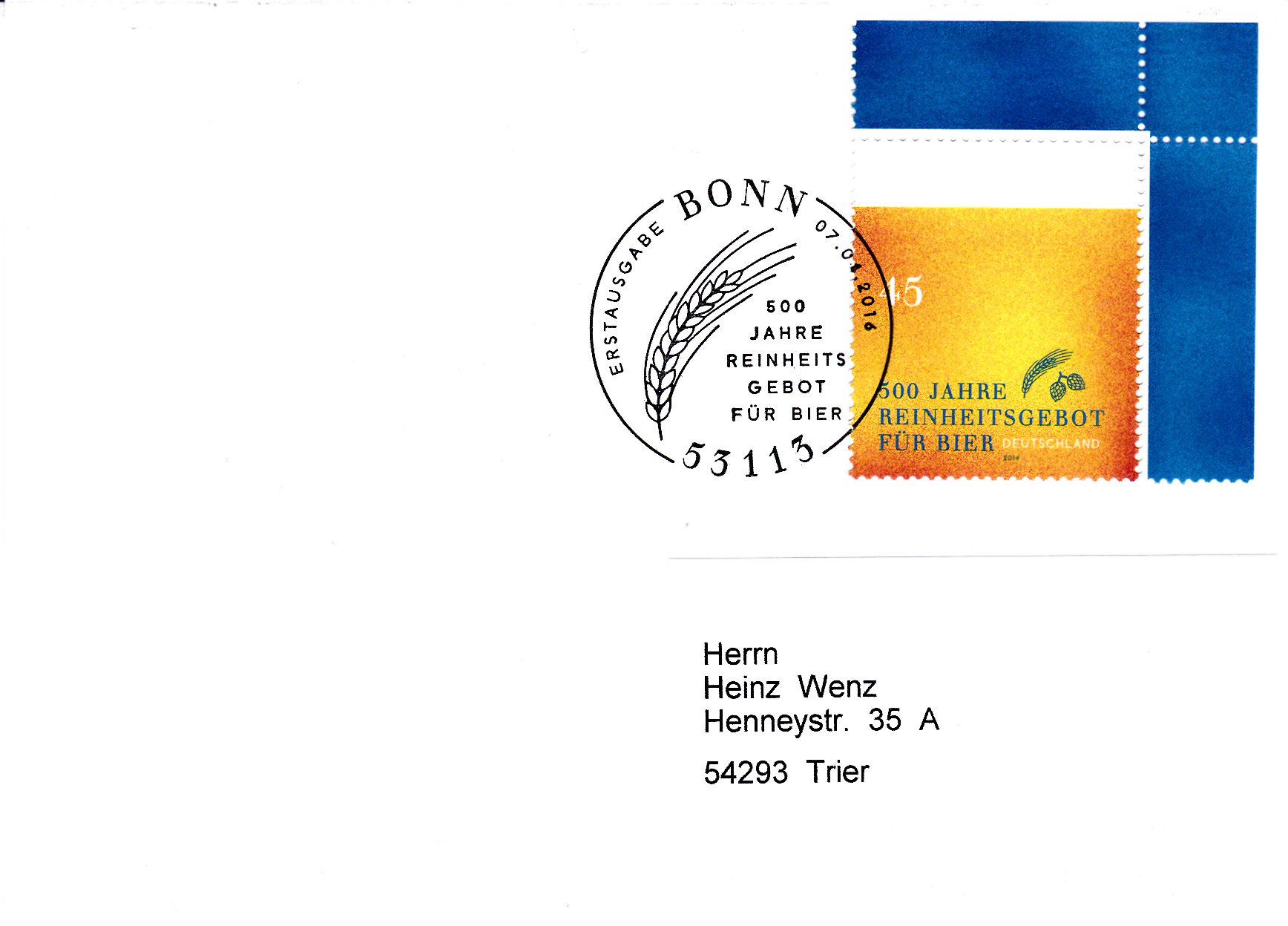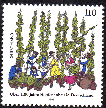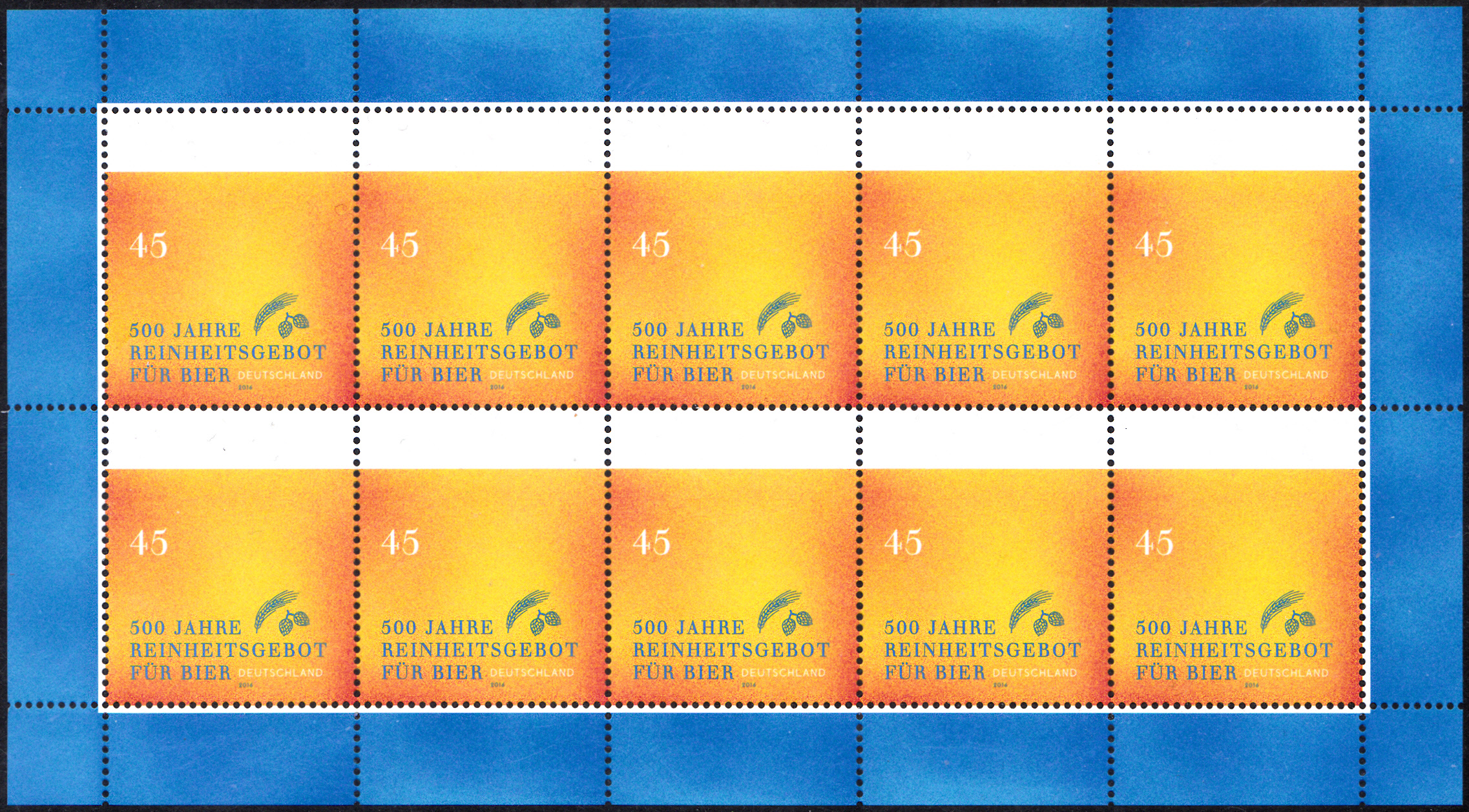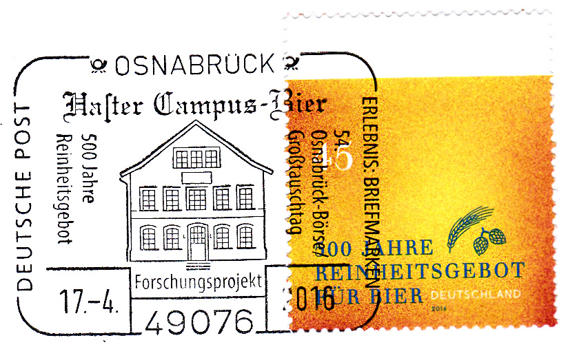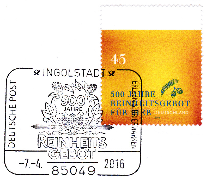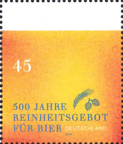 Zum Jubiläum "500 Jahre Reinheitsgebot für Bier" erschien diese Marke (MiNr 3229). Die Marke ist in der Farbgebung so gehalten, dass die Färbung der Marke ein "Bier mit Schaum" symbolisch darstellt. Außerdem sehen wir klein noch Gerste und Hopfen.