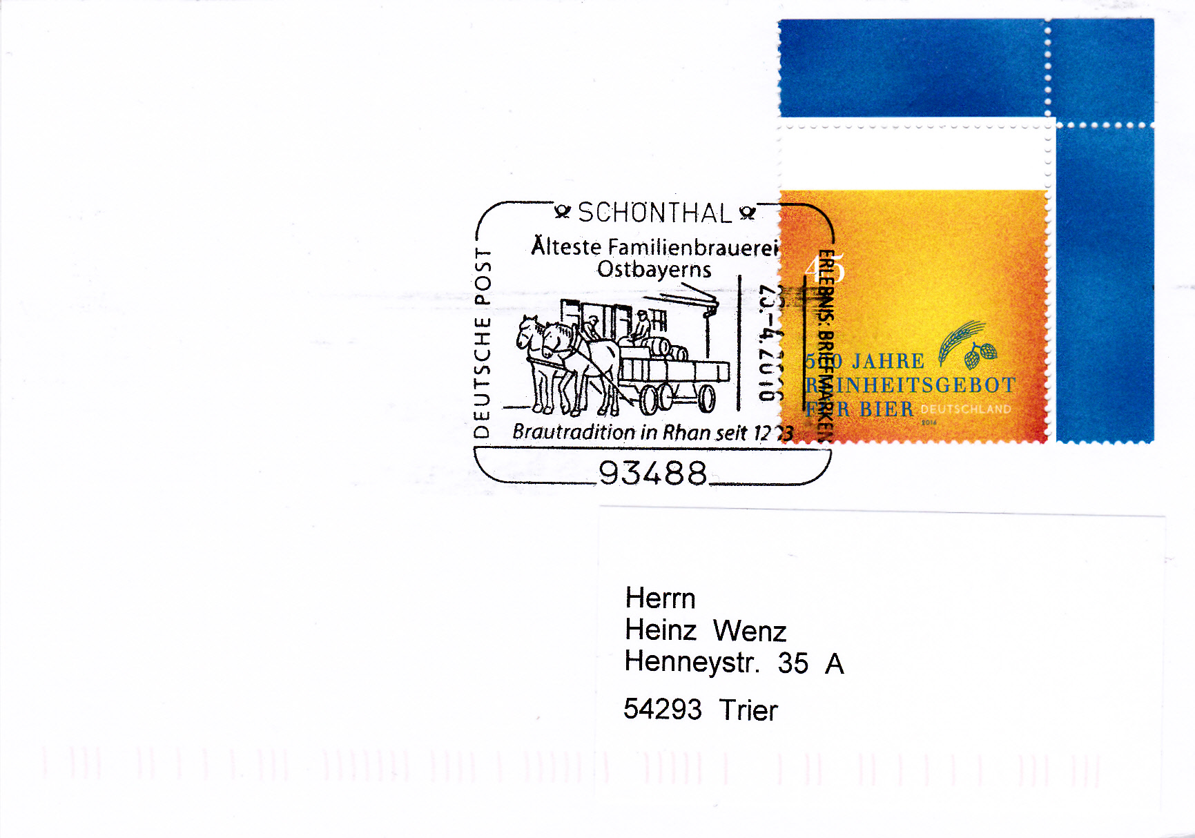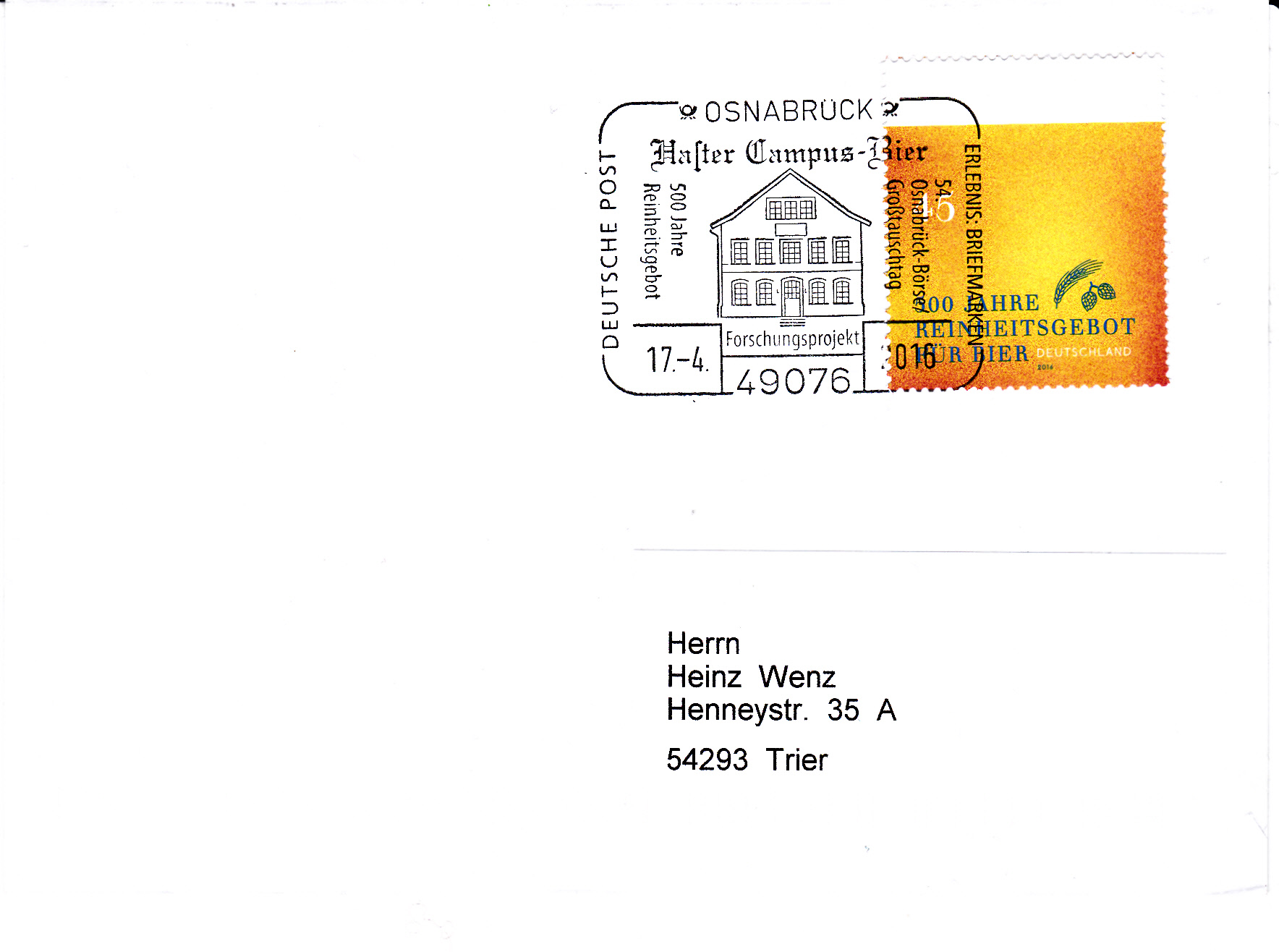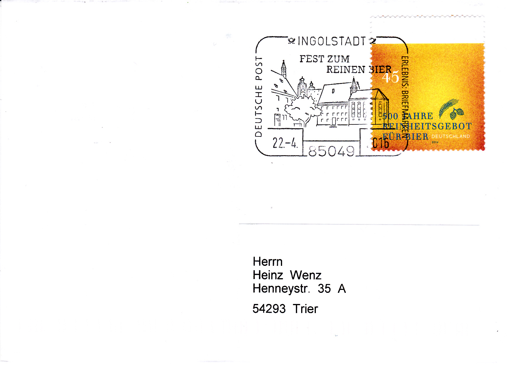 Zum Jubiläum "500 Jahre Reinheitsgebot für Bier" erschien diese Marke (MiNr 3229). Die Marke ist in der Farbgebung so gehalten, dass die Färbung der Marke ein "Bier mit Schaum" symbolisch darstellt. Außerdem sehen wir klein noch Gerste und Hopfen.