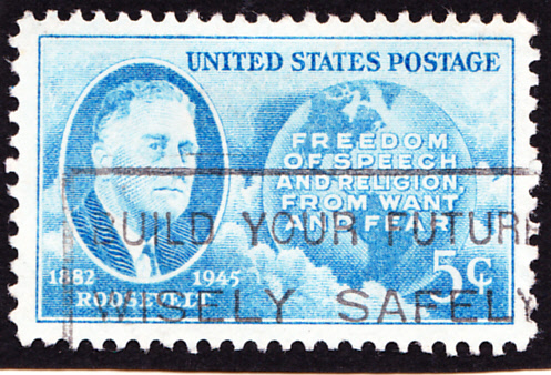 Zum Tode Franklin D. Roosevelts erschienen in den USA vier Sondermarken. Hier die Marke (MiNr 537) vom 30.1.1946 mit seinem Porträt und einer Weltkugel und "vier Freiheiten". Die "vier Freiheiten" (Freiheit der Rede und und Religion, von Not und Angst) formulierte US-Präsident Franklin Delano Roosevelt am 6. Januar 1941 in seiner Rede zur Lage der Nation vor dem Kongress.