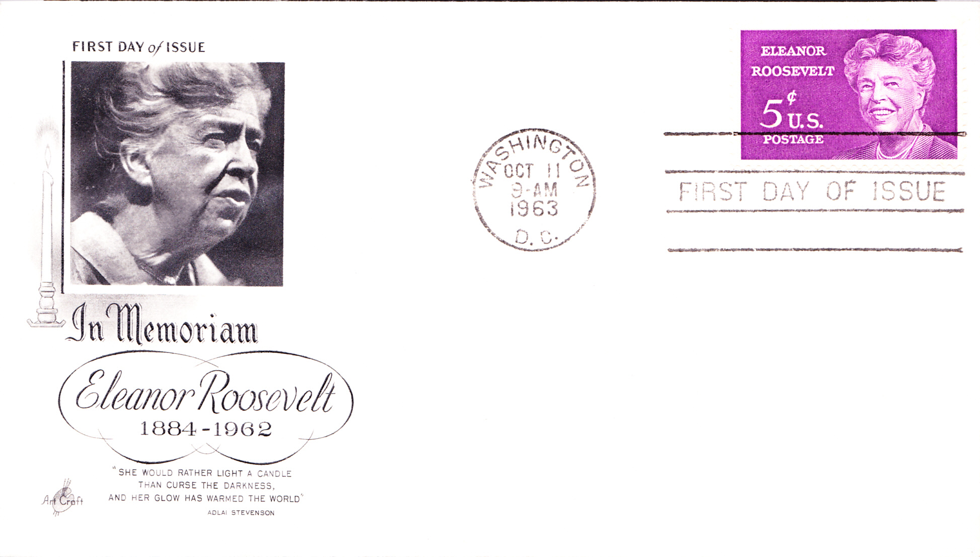 Am 11. Okt. 1963 erschien in den USA eine Sondermarke für Eleanor Roosevelt. Hier die Marke auf einem FDC: