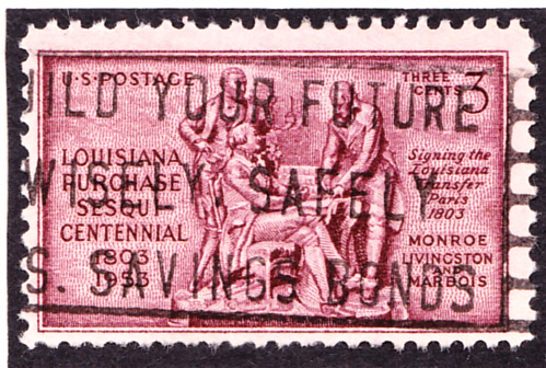 dazu gibt es auch eine Sondermarke (MiNr 639) der USA zum 150. Jahrestag des Kaufs von Louisiana (Louisiana Purchase). Sie erschien am 30.4.1953 und zeigt James Monroe, Robert R. Livingston und Marquis Francis de Barbé-Marbois bei der Unterzeichnung des Kaufvertrages.