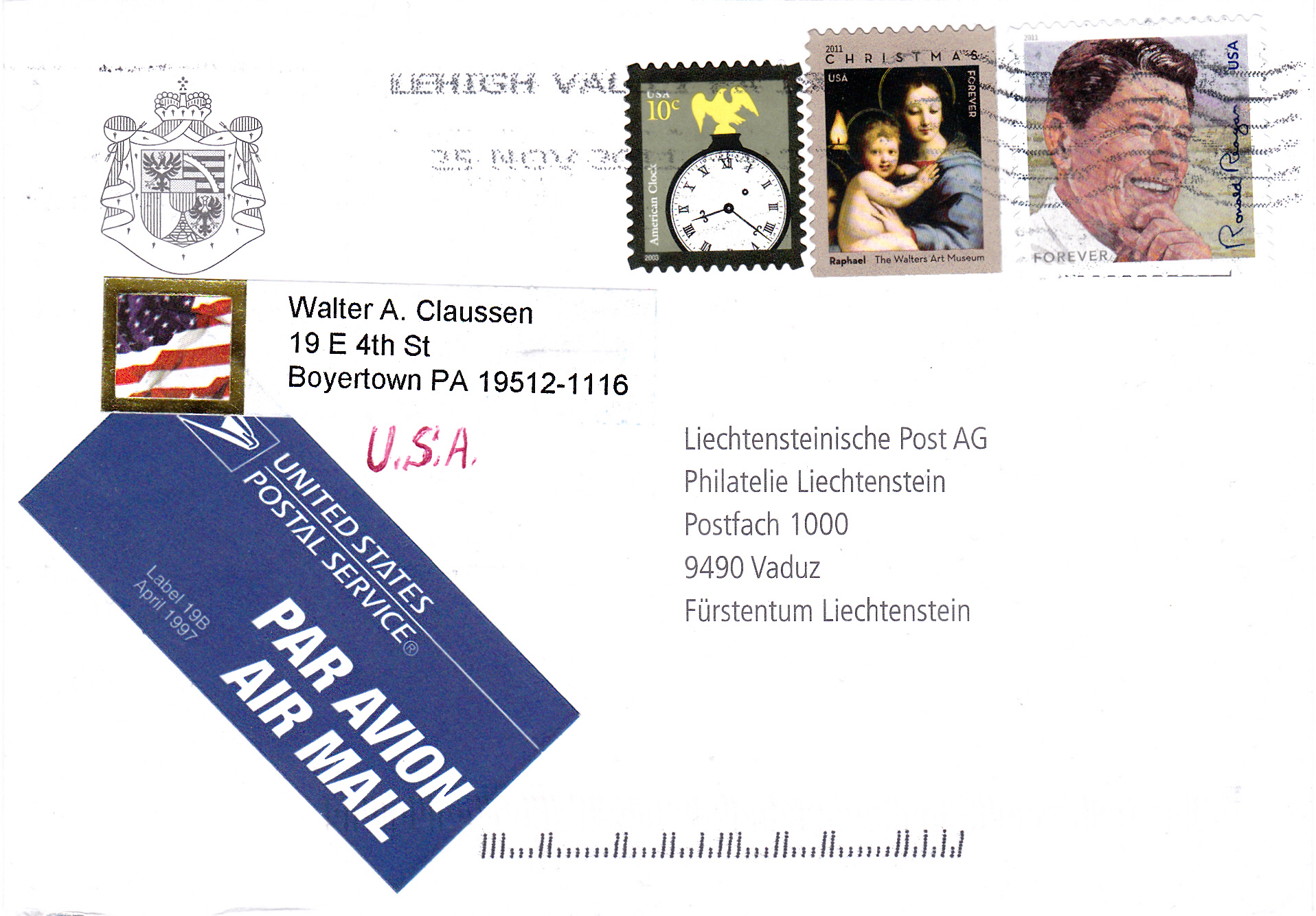 Zum 100. Geburtstag von Ronald Reagan ist in den USA eine Marke erschienen. Sie wurde zur Zeit der Ausgabe zu einem Nominalwert von 44 Cent verkauft. Hier wurde die Marke zur Frankatur eines Briefes mit Luftpost nach Liechtenstein verwendet.