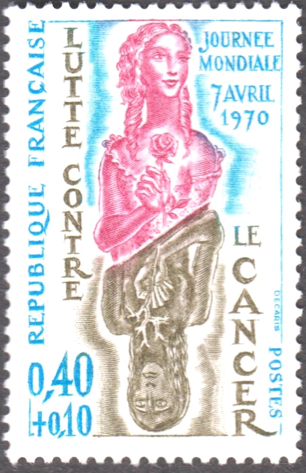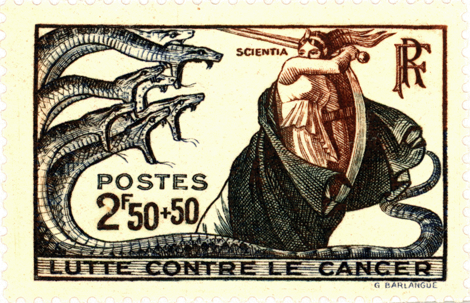Den Slogan "LUTTE CONTRE LE CANCER" findet man übrigens bereits 1941 auf diesem ausdrucksstarken französischen Postwertzeichen zum Thema "Kampf der Wissenschaft gegen den Krebs":